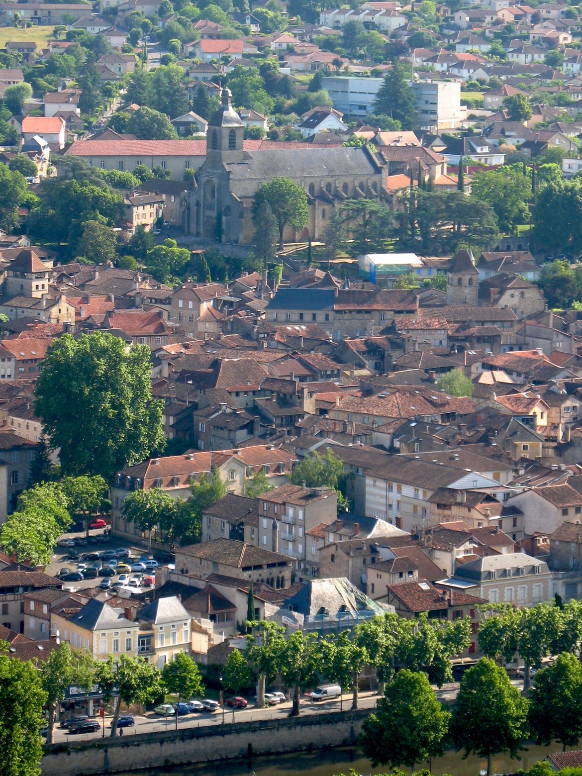 Hommage rendu, on découvre la ville retenue à nos pieds, et son étagement sur les contreforts de la route de Rouqueyroux et des hauts plateaux ségalins : les quais du Célé et le pont Gambetta, l’église Saint-Sauveur, la tour du Viguier, la butte du Puy et Notre-Dame en alignement à l’ouest, devançant le quartier du Pin et son vieux pont ; la place Vival au centre entre l’hôtel de Salgues (sous-préfecture) et l’hôtel de la Monnaie – il pointe sa cheminée “sarrasine” coiffée d’une mitre -, et au nord, mais déjà occultés par le maillage urbain, les remparts du champ Saint-Barthélemy, la place du Foirail et l’espace François-Mitterrand. Au-delà de Montferrier et du barri d’Aujou, la vision se perd dans le vallon qui progresse vers Planioles en direction de Gramat et Brive, ou vers les quartiers modernes conduisant vers l’usine Ratier et la départementale de Cahors. Dans le fouillis sauvage des frondaisons de la route de Lissac, se distinguent aussi les bâtiments modernes de l’IUT de la ville. Quant à l’inflorescence de sa riche architecture, dans sa diversité depuis le XIIIesiècle, il faut bien sûr entrer dans la ville pour la découvrir, et se persuader de sa valeur de témoignage.