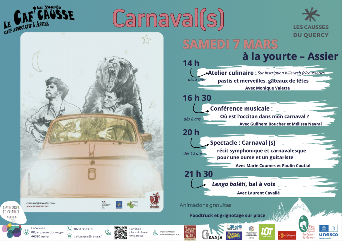 Alors que la sève monte et que la vie retrouve une énergie nouvelle, les habitants d’Assier se préparent à vivre au rythme du carnaval ! Le samedi 7 mars, la yourte du centre social et culturel Reissa accueillera une journée entière d’animations festives et participatives, pour petits et grands, autour des traditions occitanes et carnavalesques.