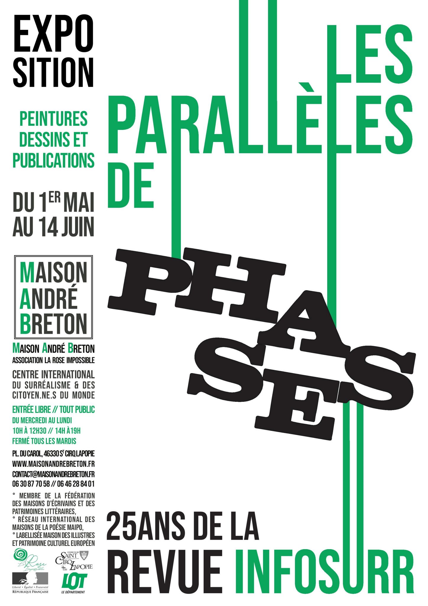 À l’occasion de ses 25 ans, le bulletin Infosurr qui veut rendre compte de l’histoire et de l’actualité du surréalisme et de ses larges environs, consacre une exposition au mouvement Phases, qui, pendant plus de 50 ans, a vécu en parallèle avec les différents groupes surréalistes de partout dans le monde, collaborant avec la plupart d’entre eux. Phases s’est situé dans la lignée du surréalisme et de l’abstraction mais sans exclusive. Phases fut surtout attentif à tous les nouveaux signes d’une « révolution dans l’art » toujours à (re)faire, autour de son animateur Édouard Jageur, Phases a été un creuset où se sont rencontrés de nombreux artistes venant de partout et de nulle part – certains seront ensuite très connus et la plupart n’oublieront pas d’où ils viennent.