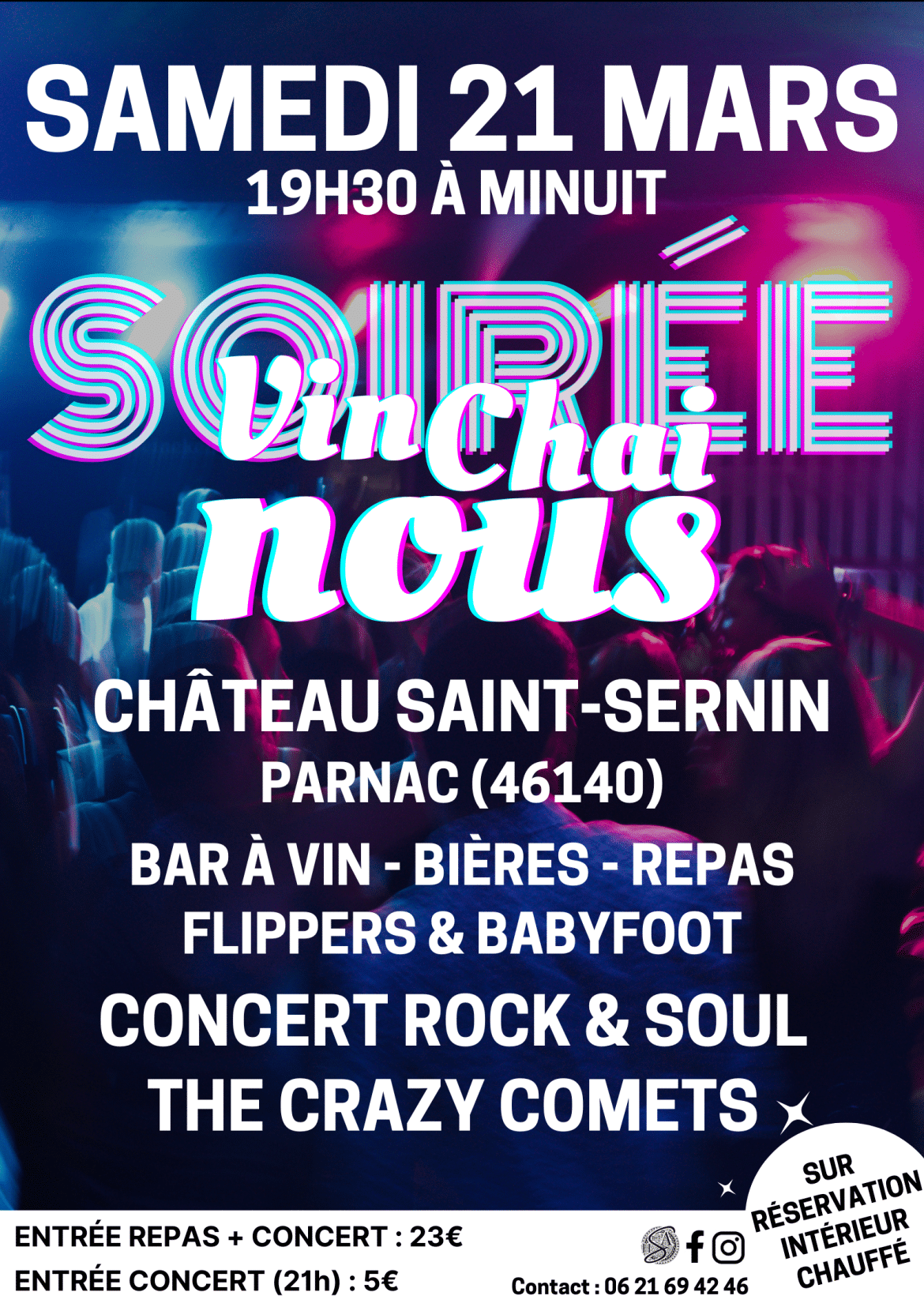Réservation : 06.21.69.42.46 ou sur la billetterie : https://www.billetweb.fr/soiree-vin-chai-nous2